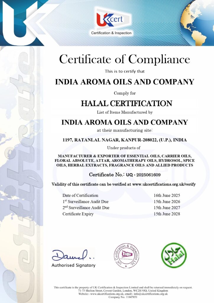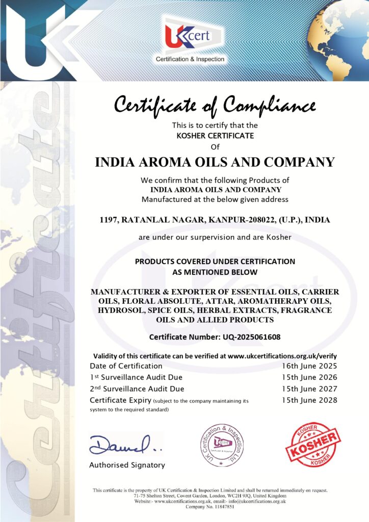 INDIA AROMA OILS AND COMPANY “INDIA” maintains full product traceability throughout import, processing and export. Operating closely with makers, integrating certifying bodies measures and applying unique batch codes, we are gifted to promise batch veracity through every stage of the source chain.
